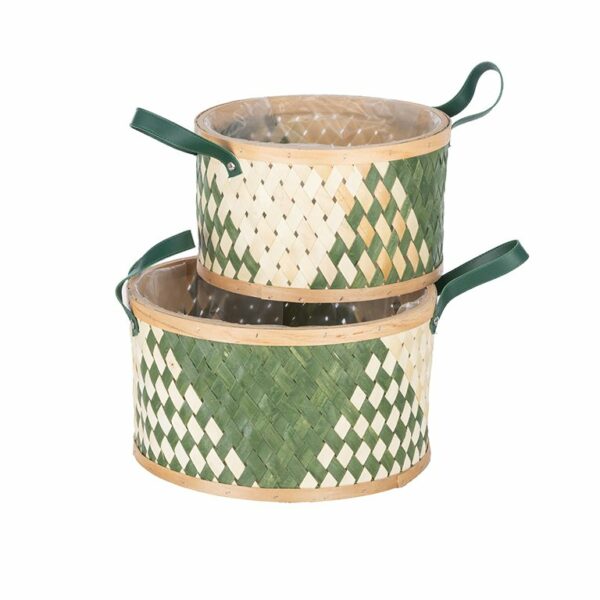 Inicio » Tienda » Cestería » S/2 CUENCOS C/ASAS. PEQ.: 28 D., H.16 GR.: 32 D., H18 MADERA VERDE Y NAT.